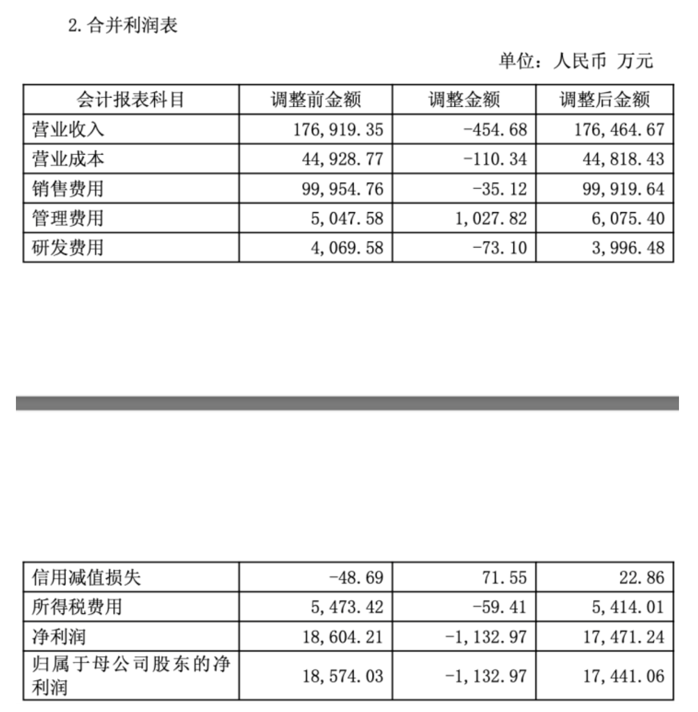 根据丸美生物发布的关于前期会计差错更正后的财务报表,2025年上半年,丸美生物调整后的营收为17.65亿元,较调整之前减少了454.68万元;调整后的归母净利润为1.74亿元,较调整之前减少了1132.97万元。